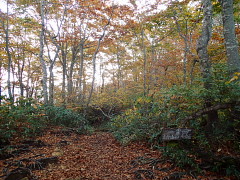| 気温が低くて寒いが僕らには丁度良い。細い流れの沢を2度ほど渡渉し標高を上げていく とブナの黄葉も進んでいる。「静かだしブナの黄葉も良い感じ!」と笑顔のMICKEY。 「人気の山だからもう少し時間が経つとどんどんと人が来るよ」と僕。 7:00 小原峠。赤兎山と大長山へのルート分岐点でもある。 かつては勝山市と白峰村(現在の白山市)との間を物資を運ぶ峠道として利用されていた が、現在は廃道となっているらしい。どちらを先に行くか・・・。 混まないうちに赤兎山に行って360度の展望を楽しんでから、大長山で白山を眼前にして ゆっくりとランチタイムをとることにした。 |