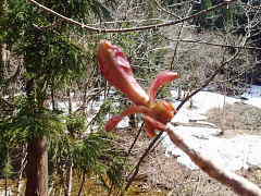 | 気温3度の早朝の美山かやぶきの里では、湘南ナンバーの人たちが散策されていた。 今日の田歌の水位は38cm。これなら芦生の水位は安心できると推測。 7時半に須後に到着して準備。すでに車が4台駐車しているが人はいない。 間もなくFさんも到着され、2010年にプロットされた分布図コピーとタヌキのため糞調 査のパネル発表の資料を頂いて、今日と明日の調査方法の事前説明を受けた。 「こんな広い流域での個体数調査は初めて」と僕。「大丈夫、大丈夫」とFさん。 7:45 須後からまずはカヅラ谷までトロッコ道を進む。職場の近くのメタセコイヤはもう新緑 盛りだというのに、研究林入り口のメタセコイヤはまだ新葉の芽吹きが始まっていない。 やはり、降雪の多い地区は季節がゆっくりと進む。 須後の橋を渡るやいなや、トロッコ道沿いの木本類や草本類の芽吹きや花がある たびに立ち止まって詳しく説明してくださる。 いままで見過ごしたり、目にもとまらなかったものまで説明してくださり感謝、感謝。 タムシバの白い花びらが落ちている。Fさんお得意の五感での観察。味覚での確認。 タムシバの花の香りと同じく、初めはほのかに甘いが段々と味がまずく変わっていく。 |