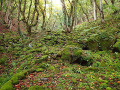 | 去年の冬には南西方向に直線的に下ったが、無雪期は笹や木々があるのでそうはいかない。 旧伊勢道を下って行く。キノコがあちらこちらに出ていたり苔の色が実に美しい。 ご夫妻が登って来た。 「上も晴れてませんよね。もうやめようかな」と言いつつ霧雨の中を登って行かれた。 |