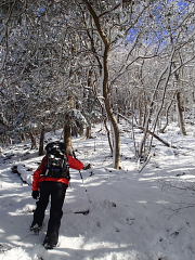 | 10:10 小野(この)峠。ここからはやや南東向きに登って東へと進む。 晴れたり曇ったり。でも出発時に比べたらとても明るいので、雪景色が美しい。 「いつも雪山に行くときは、天気が心配でちょっと憂鬱だけど、来てみると本当にいつも 綺麗で気持ちいいのよね」とMICKEY。 |