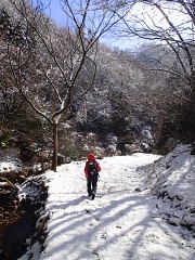 | 宮代のバス停の近くのふくらみに駐車して準備していると、登山者らしい車が3~4台 来て、宮代の集落に入って行った。きっと東進してから北進するオーソドックスなルート をとるのだろうと予想した。せっかくの新雪だ。干支の山は足跡の無いルートで登りたい。 9:25 「どこから登るつもりなの」とMICKEY。「前に下山路に使った小野峠へと向かうつもり。 そこから尾根筋を東進して山頂を踏もう。きっと今日は鹿以外、誰もそのルートをまだ 歩いていないと思うよ」と僕。西へ少し歩いて、小野峠へ向かうべく北進した。 空はまだ鉛色で雪が舞っている。「途中で、晴れてくれよ」と祈る。 林道ゲート前に姫路ナンバーのトラックがあったが、その先の林道には足跡が無い。 「よし、予想通り。人の足跡の無い雪道を歩ける」と僕。 ゲートをMICKEYが開け閉めしてくれた。少し行くともう暑くなり、フリースを脱いだ。 30分ほどすると空が明るくなり、青空が見え始めた。「うわ~、綺麗」とMICKEY。 やはり太陽光と青空に木々の雪も映えるというものだ。やはり今日は鹿の足跡のみ。 |
