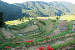 | 6:55 千枚田。狭い斜面の耕地に田が何枚もある。あぜ道には彼岸花が沢山咲いている。 能舞台もある。千枚田を上まで登ってぐるりと歩いた。気持ちの良い朝の散歩だ。 16時過ぎのフェリー予約を昨日10時50分に変更しておいたが、草壁港に着くと 7時50分発のフェリーが出航5分前でまだ停泊している。 「滑り込めるかな」と僕。 |