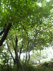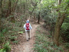 | 「あそこが下山ルートの入り口よ。2年前の12月にあった能勢電ハイクの時にはあそこ からここに出てきて日の丸展望台に行ったけど覚えてないの」と指さすMICKEY。 「この位置の景色は全く記憶から飛んでいるなぁ。新しい道標ができているね」と僕。 日の丸展望台には行かずに下山にかかることにした。 「古い道標が真新しくなっているわ」とMICKEY。しかも番号が付いているので、ハイ キング地図でも整備されるのかもしれない。ここの番号は「5」だった。 ここも日陰ルートで助かる。このルートはアベマキが多いのだが、箕面や五月山にも広が りつつあるカシノナガキクイムシによるナラガレが進行している。 |