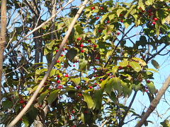 | 2番目の鉄塔で休憩。早くも次のクリスマスの飾り用にとヤシャブシの種子をとるMICKEY。 直ぐ横にはソヨゴがまだ赤い実を沢山ぶら下げている。ソヨゴの実を好んで食べる鳥を見た ことがないが、鳥にはまずいのだろうか。 山手台の北部の開発中の住宅地がほとんど整地完了されていた。もうすぐ沢山の家が建つ だろう。右(北)はゴルフ場、左(南)は住宅地とまるで舎羅林山のようになってきている。 |