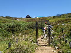 | 「青空に映えてすごく綺麗ね。ススキも多いしネジバナやヨウシュヤマゴボウ、 ツリガネニンジン、ヒヨドリバナなどの花も案外まだ咲いているのね」とセリフも 11年前と同じだ。違うのは鹿よけネットが増えていたことと、今日はガスが 全く無くて真っ青な空。「今日は最高だね!」 伊吹山も芦生と同じく鹿による植物の食害が増加しており、京大のT先生達も 協力して防鹿ネットの設置活動をされている。この前は丁度用事があり先生に 協力出来なかった。 |