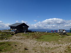 | 12:20 「着いた~」日本七高山霊場・大乗峰伊吹山寺も開いていた。その横の売店も営業中。 11年前の「だれもいない時間」ではなく、すでに11時を過ぎているので、北部の山頂から すぐの駐車場から簡単に登って来る人達も沢山居て、山頂付近はすごい人の数だった。 「測候所の横にある三角点に行くより、先にコーラだね」「天気は良いが風はきついなぁ」 売店でペットボトルコーラを1本買って2人で飲んだ。250円だった。 (測候所は無くなっていた。2001年(平成13年)3月31日 に 伊吹山測候所の観測が終了し、 跡地は2010年に撤去されて更地化された。 ) 日本武尊の石像前で写真を撮り、三角点に行き、北側ベンチに行ったがすごい風。 「南側の展望ベンチに移動しよう」とMICKEY。そこで昼食用意。 |
