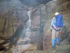 20mの滝の左を巻こうとするが「あの岩壁は登れないぞ・・」と、よ〜く見る