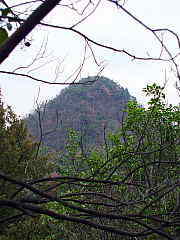 | 11:50 追谷山。三角点にタッチして、コーヒータイムと考えていたが、カートのエンジン音がと てもうるさい。この先の愛宕山で休憩することにして先へと進む。 右手(西)には昼ケ岳が見える。踏み跡通りに歩いていると下り出す。これは猪名川霊園 へと続く道のはずで尾根筋を南進する道ではない。地形図をチェック。 |