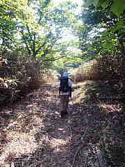 | ここから少しの距離は、両側が背の高い笹に挟まれ風が止まりちょっと蒸し暑い。 前からジャズの音楽が聞こえると思うと、ご夫妻連れが下山されてきた。 あの駐車場にあった車の方だろう。「おはようございます」 |