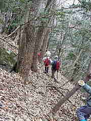 | 下っていくと、途中にはいくつも炭焼き窯の跡がある。 ズズズズ−っと落ち葉の絨毯に滑ってしまい左手を着いた瞬間に腕時計が はずれて飛んでしまった。「特攻機の破片かと思ったら矢問さんの腕時計だ」 と、後ろを歩いていたかねちゃんが拾い上げてくれた。 「ありがとう!ベルトの止めピンが折れてはずれて落ちたみたい」 感謝! 沢筋の左岸を下る。アケビやタラの芽などの山菜の話しに盛り上がる。 下りながら前方には、追谷山の姿が見える。 |
