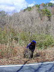| 9:30 「西国三十三所供養塔・右志づ川 左ささ山」と彫られた石碑から峠道に入り、差桐峠を 目指す。竹林を過ぎると墓場になり行き止まりとなった。MICKEYが右端に踏み跡を見 つけてくれた。今は使われていない小柿から乙原へと抜ける差桐峠へ続く旧道はこれだ。 所々倒木があったり、土が流れて岩がゴロゴロしているところもあるが、歩きにくい峠道 ではないが、早くも息が切れる。MICKEYも息が切れると言いつつ、僕を抜いて行った。 |