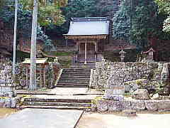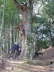 | 登山口から登ると直ぐに巨樹が迎えてくれる。左には竹林という風情ある登山口だ。 すぐに千手観音を祀る赤坂山観音堂がある。MICKEYと鐘をついて拝んだが、この鐘の 音が実によい響きをするので感動した。崩れ落ちそうな石の鳥居をくぐってさらに登る。 右に滝跡という道標がありMICKEYを待たせて1人でしばらく行ってみたが、地形図か らも相当距離がありそうなのでやめて戻った。 |