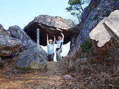 それに従い左へと登る。丁度先ほどの岩壁の上の台地へと続いていた。そこには祠があり 役行者らしき石像が祀られていた。ということはこの岩壁は行者岩ということか。 MICKEYが上から下の岩壁をのぞき込む。それなら先ほどの岩の割れ目に文政の年号が 刻まれた不動明王の石仏があったのかもしれない。 |