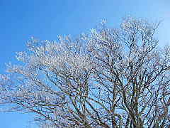 | 9:25 駒の尾山(1280.7m)スゴイ展望!! 西には雪をかぶった那岐山、おおっ大山も見える。 北には沖ノ山や東山が見える。山頂西側斜面の木に付いたエビのしっぽが太陽に照らされ てパラパラと音を立てながら落ちている。晴天にはえて光り、蝶が舞っているように綺麗だ。 |