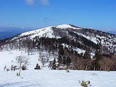 | だんだんと展望が開けてくる。右前方には鍋ケ谷山、船木山、その向こうに後山が見える。 振り返るとどっしりとした日名倉山が見える。もうすぐピークと思ったらまだ先だった。 |