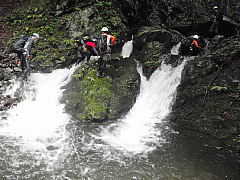 | 谷幅1.5mの廊下奥に10mの滝が吹き出しているが近づくことも出来ない水量。 PINEさんがトップで右のガリーを登る。粘土質の土に水が多くてズルズルがひどいので 安全のためにザイルをセット。後続はアッセンダーをつけて草や木の根をつかみつつ登る。 これまた沢に下りる急斜面は慎重に木の根をつかんで足場を探しつつ下る。 ここからの小滝は快適にそれぞれのルート取りで通過。 |