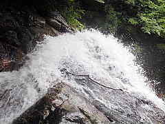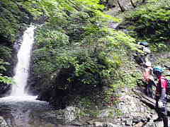 | 12:10 「ゴーーー」音が違う。前を見ると15mの滝が水しぶきをまき散らして吹き出している。 「今回が一番水量が多くて綺麗や」とBAKUさん。滝のそばに行く前に右のツルツルの 岩盤を登らないと行けない。PINEさんが登り、くりさん持参のロープをセット。 みんなはそれを手にして登る。「うわ〜すごいわ〜」マユさんは大感激の様子。 |