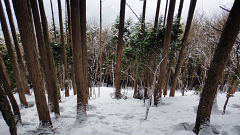 | 地形図のCa793m地点当たりから尾根に取り付こうと思っていたので斜面を登り北進。 この辺りの斜面は50cmほどの積雪。まだスノーシューがザクッと沈む。雪解けが雨で どんどん加速しているのだ。「標高1,000mあたりからしっかり締まっているはず。我慢」 粉雪がきつくなってきた。「また山頂では展望無しだろうな・・。やめて帰ろうかな」と 何度も頭をよぎるが、筋力回復テストと割り切って三室山の山頂までは行くことにした。 Ca950mあたりで檜の植林帯から抜けて明るくなった。雪が締まり始め、スノーシューが ほとんど沈まなくなった。「よし、急ぐことはない、ゆっくりゆっくり」と1歩1歩登る。 鳥が周囲で鳴き始めた。粉雪も止んでいる。上を見るとうっすら青空がのぞいていた。 「このままうっすらでも晴れてくれればなぁ」 |
