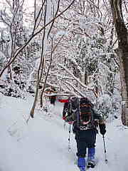 | 先頭を山日和さんからふ〜さんに交代。その後順番に先頭を交代する。通風山さんとバー チャリさんもバトルのように登っていく。kasayaさんも力強い。グーさんが先頭の時「も っとみんなを引き離して前に出て、前方からみんなが登ってくるのをカメラで写したかっ たのになかなか引き離せない」と悔しがっていた。(結局、下山までその場面は無かった) 雪質は年末に登った湖西の釈迦岳よりは重くはないが、やはりパウダーとはいかない。 20cmほど沈む。「おおっ、ウサギや」とグーさん。ウサギや小動物の足跡も多い。 膝下くらいの雪深いところは雪がやや重くて足を抜くのにパワーがいる。 「矢問さん、出番やで〜」とグーさん。先頭はスノーシューでも膝まで沈む。 「矢問さん、雪蹴り上げて進んでる。パワフルや〜」と通風山さん。 「矢問さんが歩いた後は歩きやすい」と、とっちゃん。体重差のなせる技と言えるのか。 「うわっ」木のそばの雪穴からウサギが跳びだして走って逃げた。かわいいものだ。 登りであえぎつつ、「矢問さん、無線機で交信してみてくださいよ」と通風山さん。 ID92でD-STARにてカーチャンク。反応表示は届いたり届かなかったり・・・。 「あれ?JN3OUJさんともう一局のコールサインが表示されたような・・」急いで応答し たが、電波が山の斜面に遮られてか、うまく届かない。残念・・・。 「東妙理山を過ぎて稜線ではきっと届くだろう。」ガツガツ登る。 右手(東側)の雪景色の山々が木々の間に見え隠れして実に美しい。 山日和さんやとっちゃんが雪の頃に登ったという山々の尾根も見える。 「あれは上谷山、あれが横山岳」と山日和さんから山名を聞く。本当によくご存じだ。 とっちゃんも山日和さんとともに沢山の雪山を登っており、今日も快調で元気だ。 東妙理山の手前からはまた急な登りとなる。ふ〜さんが先頭で頑張る。「ふ〜さん、短く 交代していけばいいよ」と言うと「ありがたい!」と返事しつつ、パワフルに稜線まで先 頭で登っていった。若さのパワーは素晴らしい!そして感謝! 登りの熱い吐く息と汗で、拭いても拭いてもめがねがくもってばかり。あと一息で稜線だ。 |