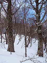 | 「ここは新緑の頃も素晴らしいでしょうね」と僕が言うと「来られたらね」と山日和さん。 「あっ、そうか無雪期は激藪の山か・・」と気づく。所々に雪から小枝が出ているが雪の 多い頃を知ってる洞吹さんは「こんな藪枝もすべて雪の下でスパーッとどこでも歩ける気 持ちのいいブナ林だった。今年は雪が少ないね」と。 |