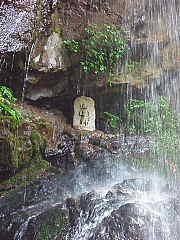 | 滝を見つめる茂木師匠 | 滝裏に石像がある |