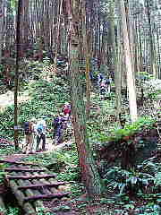 | 大親寺の横を通って(下山時は境内を通る)、ややぬかるんだ登山道を慎重に進む と、丸太の橋があったり、木の根がいたるところに出た急な傾斜の掘り割りのような 登山道となる。段差を伝え、右に左にと登る。僕のザックから出たサポートロープを 持った田頭夫人はその動きを感知して的確に足を運ぶ。後ろからは中本さんが、 狭い足場の通過時には田頭夫人の足元を注視してくれている。 |