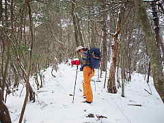 | 9:35 高ンボ。展望は良くない。「ここからがMICKEYさんが間違ったルートですね」 と、てるさんは僕の過去の記録を読んできていたようだ。 「見た目はなるほど間違いそうだけど、コンパスを見れば明白というのも理解できる」 といいつつ、進むべきルートが見つからない様子で左手を探すてるさん。 「この岩と岩の間に続くルートが見えるよ」と僕。「あっ、ホントだ。わかりにくい(^^;)」 静かな自然林と雪のコントラストが綺麗だ。 と、突然「バーン」と銃声が聞こえる。「こわ〜(^^;)」とてるさん。 「北摂は3月中旬まで猟期だからね。注意して」またバーン、と聞こえる。 |