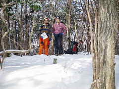 | 10:35 P711m山。てるさんが斜面を元気に登ってくるのを待った。ここからの景色は最高。 今日は大野山が実に綺麗に見える。風もなく気持ちが良い。記念写真。 ここからは尾根筋にのり、北進する。雪が深いところ浅い所など結構楽しめる。 雪が積もったプラ階段の下りにはすこし注意しながら下る。 |
