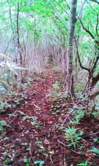 | さて、下山。下の岩の左手の倒木の急な下り。下りながら下のとうろう岩を観察すると 一部に穴が開いていて向こう側が見える。溶岩が溶けたような感じの岩肌だ。 ここからは、踏み跡道がしっかりと付いている。 細いブナや雑木林の快適な尾根道である。「あの東尾根のゲキヤブとは大違いだな。」 イワウチワも沢山ある尾根道だ。 左の沢の音が近づいてくる。沢までもうすぐだ。 途中尾根が崖に阻まれて西へ巻くあたりが不明瞭だが、やや巻き気味に左から下ると また道ははっきりするものの、急傾斜のトラバ−スなので注意が必要。 |
