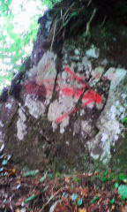 | 石仏の左に文字らしきものがうっすら彫られているが僕には意味がわからない。 やまあそさんが来訪時に解読してくれるだろう。 二体安置されているならもう一体があるはずなのに「これのみ」と思いこみ、探さずに 曇り空ながら展望が利く赤倉山方面をながめながらゆっくり休憩していた。 文字の解読ともう一体の捜索は、石仏熱中人のやまあそさんに託すことにしよう。 5日に佐野さんたちとここに来ていれば、ボルダリングで2つの岩のてっぺんに登ったか もしれないが、今日は1人なのでロープはあるものの登るのはやめておいた。 |