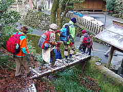 | 左下に民家が見えだした。「茶宗明神社までもうすぐですよ」 最後に丸太橋を慎重にサポートして渡ると目の前が茶宗明神社だ。 |