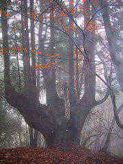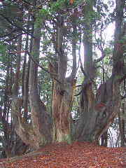| あとは少し西に進みずっと北北西進すればよい。「おおっ、すごい巨木(@_@);」 と稜線やその左右の斜面に芦生杉が次々に現れる。「芦生の京大研究林で巨木と の対面には慣れてるはずが、太さと数のレベルが違うなぁ」「すごいわ〜(^^)」 と上を見たり左右を見たり二人とも何回「うわ〜、すごい!」を繰り返したか。 芦生杉の特徴の伏条更新で、幹が根に近いところからいくつも別れて蛸の逆立ち 状態の樹形が見事だ。その太さが今まで見たものより格段上! 霧雨も上がり霧がよけいに幻想的にする。 「いい雰囲気やなぁ」「ここ、いいねぇ。敗退せずに来て良かったわ〜(^^)」 「神秘的で精霊が住んでいそうな感じがするよなぁ。ホントにスーッと心が落ち着く感じ」 「お母さんにも見せてあげたいわ〜(^^)でもこの尾根筋に並行してすぐ右下(東側)に ついてる林道が気になるね。この裏杉群生地を守られるかなぁ。なんでこんな林道が 要るのかなぁ・・・・近すぎるし裏杉の根も傷ついてるのと違うかなぁ・・・」 |