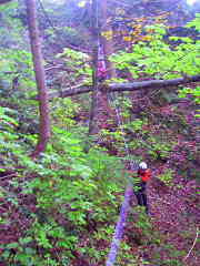 中ノツボ谷遡行は小川のせせらぎ歩きのように始まる。1mの滝があり20分ほ ど行きやや左に曲がるとせせらぎからは想像できない15mの滝が急に現れる。 手前で「ウヘッ」滑りやすい岩で足を取られて前のめりに水の中にドボンの僕(^^;) ここは滝の右にある細い木のある岩を登る。足場も狭い。じゅんちゃんももりき みさんも慎重に登る。ゲキさんが苦戦して上からBAKUさんがロープでヘルプ。 最後に僕が登ってわかったが、岩面の細い木は上に上げると簡単に動き、これら の木をつかまないと手がないところもあるのだが、根は上部4分の1ほどしか生 きていない。信じて体重をかけすぎると木もとれて滑落もありうる。 いつまでこの木はあるのやら・・・。斜面をトラバース気味に進み沢に降りる。 先に僕がロープを張りに行く。所々に古いロープが残っている。 「この滝の巻きでやっと目が覚めました」ともりきみさん。 |