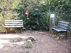 | 10:45 尾根に出た。展望がややあり丸太のベンチが2カ所。紅葉はやはりまだ早い。 自然林の気持ちの良い尾根道だ。おおさか環状自然歩道でもある。 |