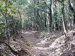 | また下り戻って車道をさらに200m程登り、右は善峯寺の駐車場(ここも500円!)への 所で、左の沢をまたぐ東海自然歩道で釈迦岳経由でポンポン山へ行くことにまたまた予 定変更。なかなかいい感じの山道で、静かで涼しい。 しばらく登って上着を脱いでTシャツに。 |